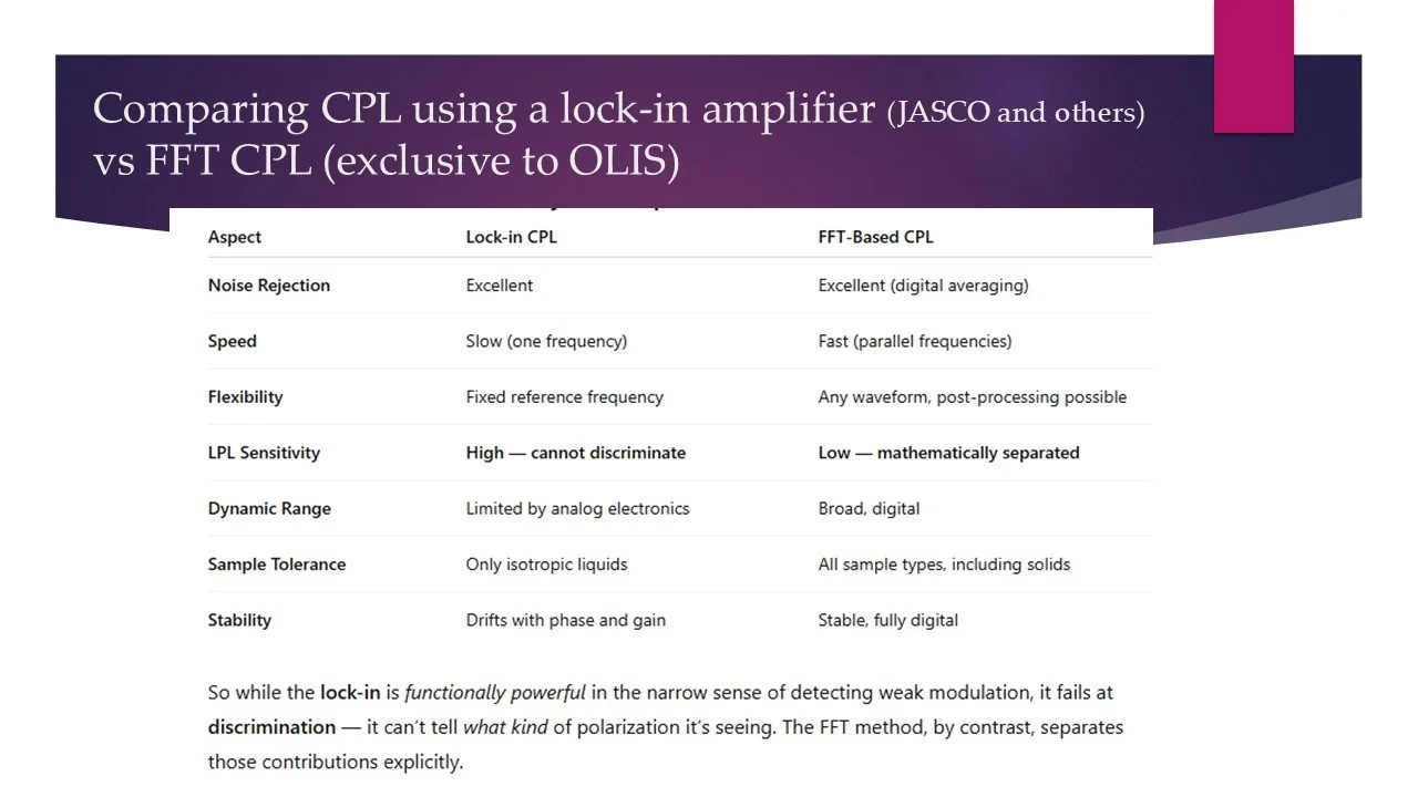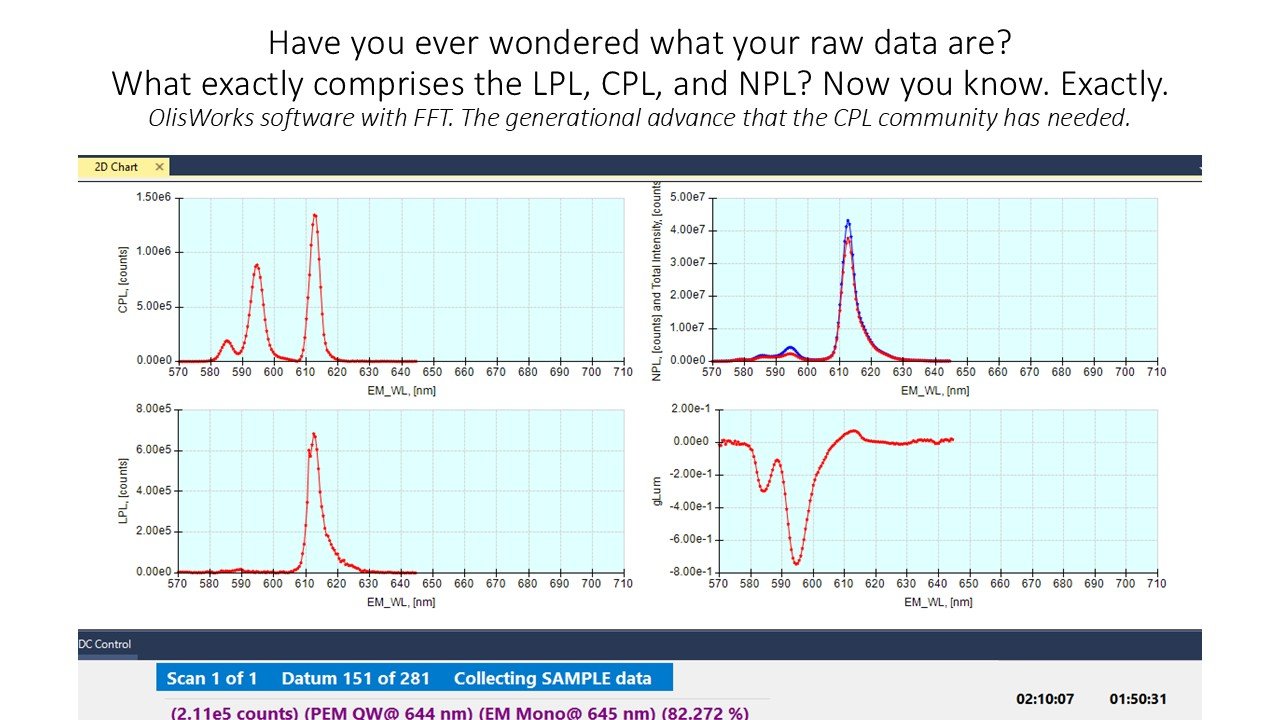 Since the 1990s, data collection on all OLIS CD and CPL spectrometers is as perfectly digital as technology allows. No analog lock-in amplifier is required or used. Thus, in CD and in CPL, OLIS software is acquiring raw data. This is a huge advantage over the other products which can only return to the researcher already processed data and which cannot collect CD or CPL on first principle.