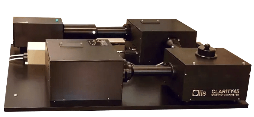 While the OLIS DM 45 has single monochromators on both the excitation and emission sides, the DM 245 uses a double on the excitation side, making it the better choice for high resolution absorbance studies. Commonly configured as the OLIS DSM 245, where CD and CPL join absorbance and fluorescence.